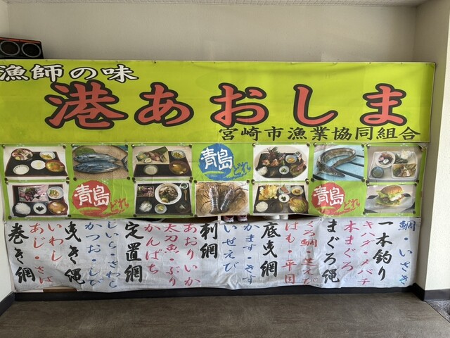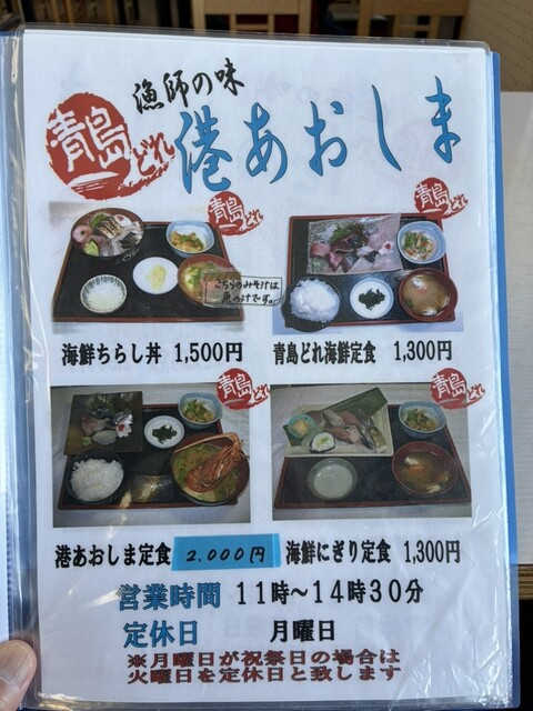 大きな窓越しに青島漁港、その先の青島を見ながら海鮮ちらし丼をいただきました。