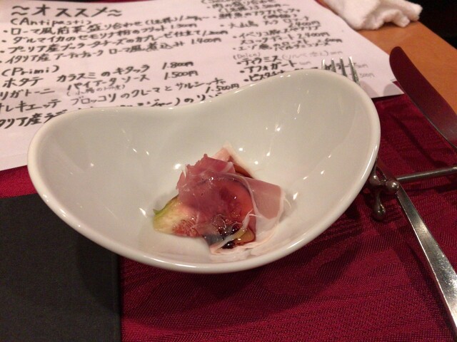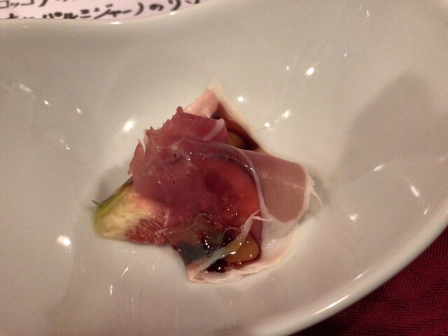 熟したイチジクに生ハムをまとわせてバルサミコソースをかけています。