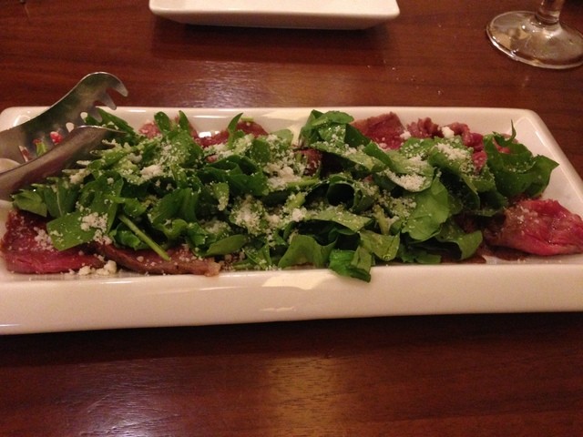 ミディアムレアな和牛に葉物野菜と粉チーズ。