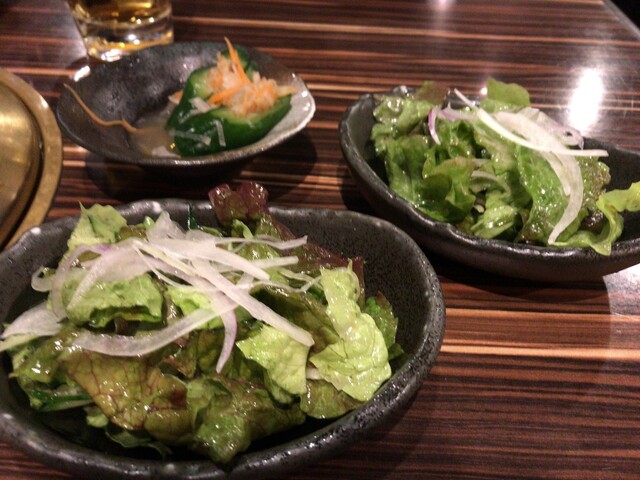 まずは上タン塩と上カルビ。キムチとサラダもいるよねってことで注文。