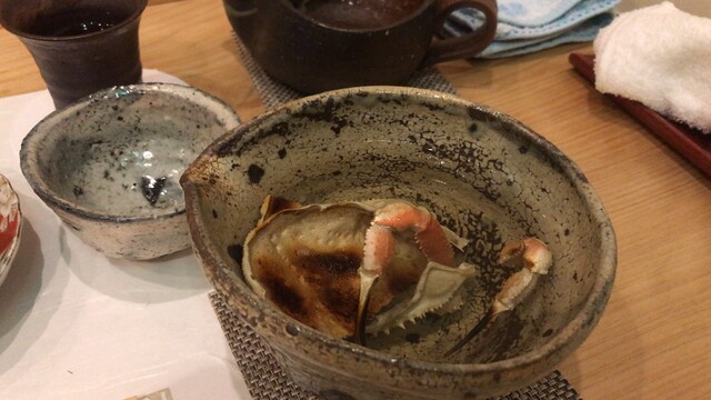 希望すれば、食べ終わった後の香箱蟹の甲羅と爪を炙って燗酒にしてくれます。