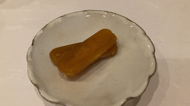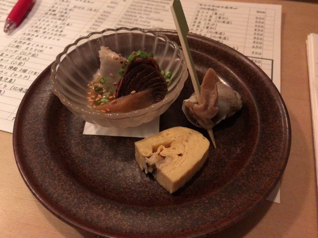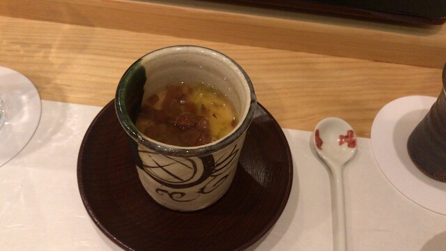 つまみ、噴火湾あん肝・横須賀長井天然とらふぐ・ふぐの皮の茶碗蒸し・横須賀長井アカザエビ・横須賀佐島甘鯛蓮根蒸し・アボ蟹(蟹のアボカド包み)・からすみ。