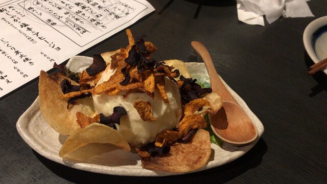 最初の日本酒は佐久の花。ポテサラと天ぷらで呑む、至福です♪