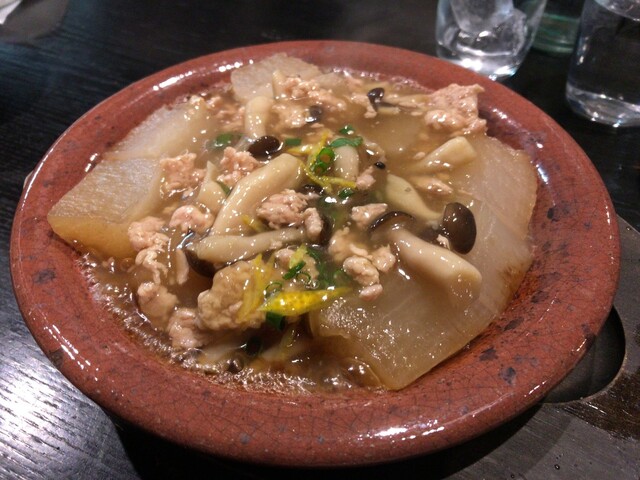 熱々のお皿にそそり立つ大根、目の前で切り分けて餡をかけるとグツグツ。