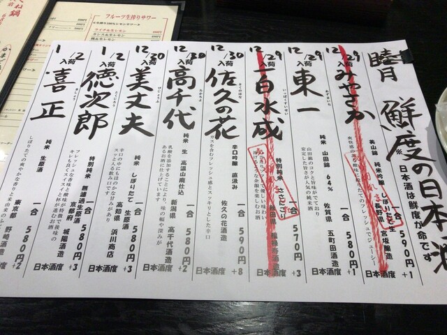 2号店はほとんどの日本酒に赤線が引いてありましたが、こちらはそこそこの種類から選べます。