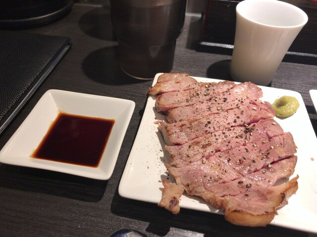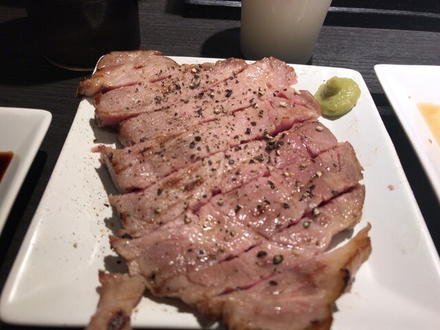 ミディアムレアな厚切り豚肉、わさびと甘い醤油が合います。塩でもお願いできるようですよ。