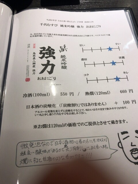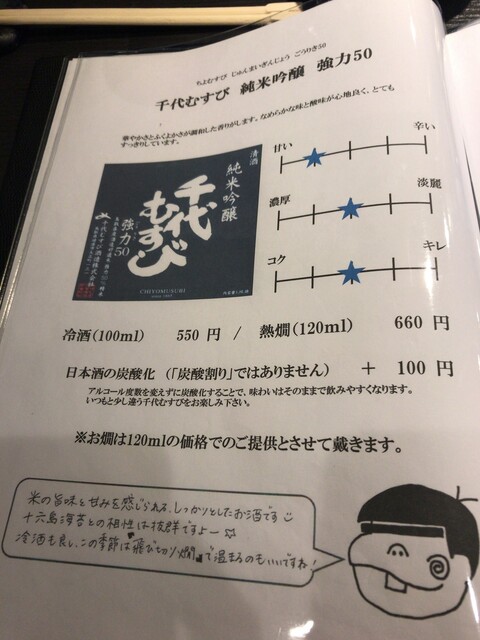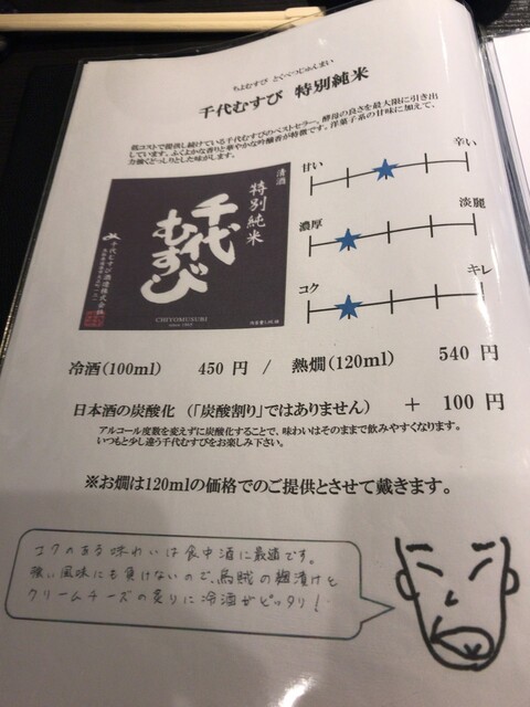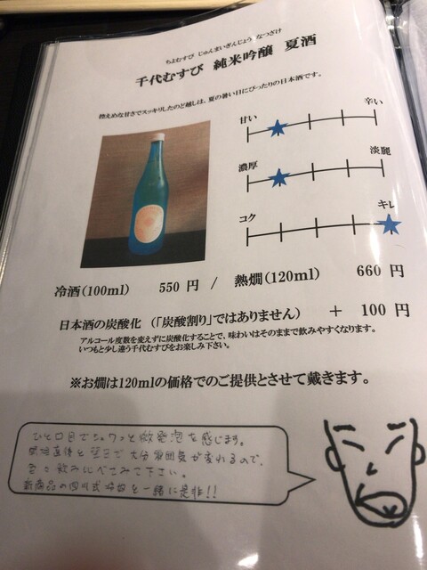 千代むすびは飲んだことなかったな~。お通し的な「とりあえず」と共に夏酒というのを注文。