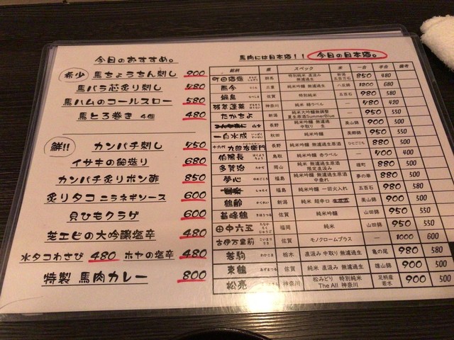 とりあえずメニューを見て日本酒と馬刺しを注文。