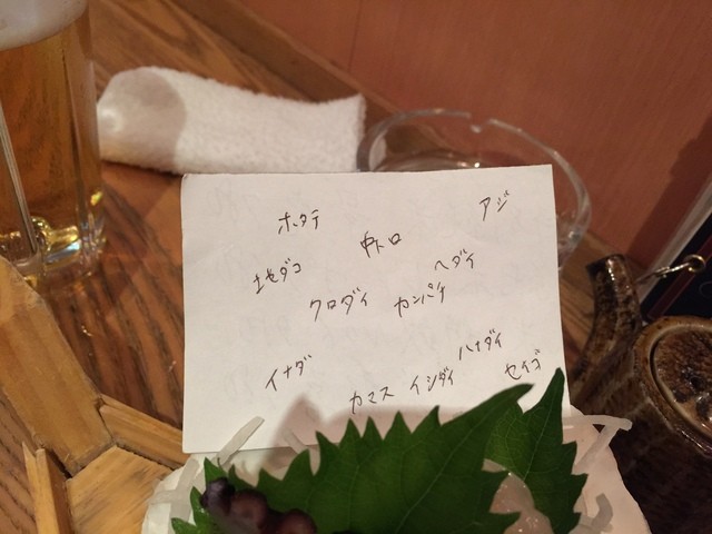 盛り付けと同じように魚種を書いたメモを置いていってくれるので酔っていても何の魚かすぐ分かりますよ(笑)