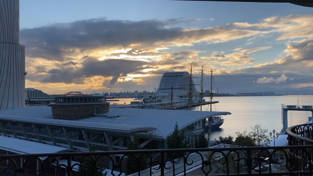 朝日が照らす神戸港を見ながら帰りの準備をして部屋を後にしました。