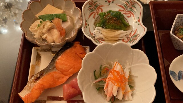 焼き鮭、明太子、酢の物、おひたし、煮物。