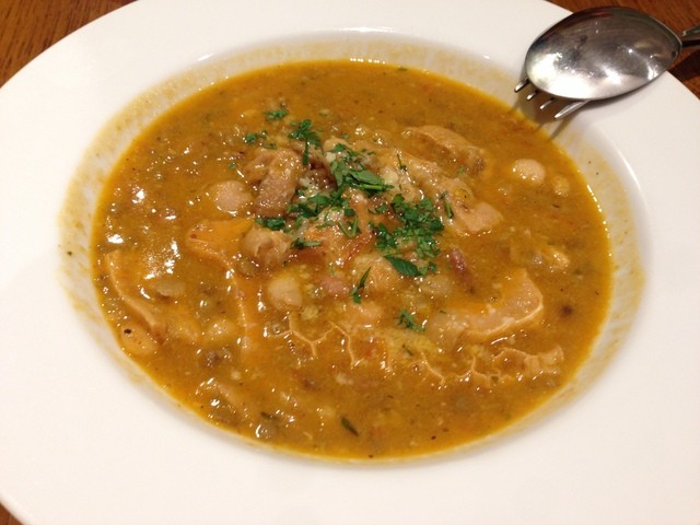 濃い目に煮詰められたトマトソースと柔らか食感の豆、これだけでも美味しいスープという感じ。