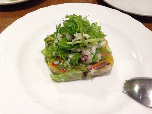 いくつもの野菜を刻んでテリーヌにしてあります。上にはズワイガニの身がのって贅沢~。
