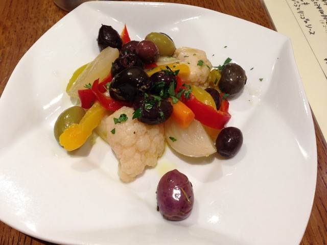赤・緑・黒のオリーブにパプリカ・玉ねぎ?・カリフラワー。彩りも綺麗です。