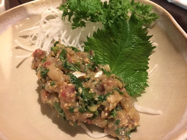 味噌は弱め、大葉を隠し味程度、混ぜこまえれた胡麻の香りがしまあじに良く合います。