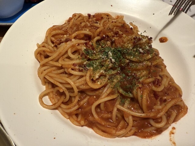 味:何ともいえない普通の味。とは言いつつも、ここは学校給食をイメージしているので、凝った料理というよりは学校給食で食べた庶民的な味がいいのです。ミートソースもアルデンテされたスパゲッティとかじゃなくて、ソフト麺。これこれ。これが良いんだよ。たまにこういうのが食べたくなるんだよね〜。そしてウィンナーもしっかりタコさんで到着。運動会でよく作ってくれたよな〜という気持ちでいただけます。