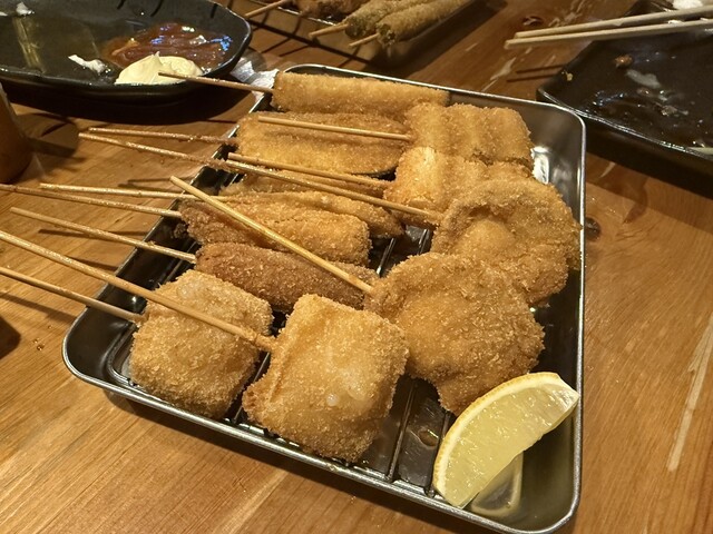 味:串揚げ美味しかった。途中で出た生ハムサラダもいいですね。コースだったのですが一品だけ数種類から選べるメニューもあったので、シメ鯖を選びました。こちらも悪くない。あと、串揚げ食べ放題だったのですが、お店から揚げたての串揚げが次々と出てくるスタイル(種類は選べない)で、3人で行きましたが5皿ほど出していただきました。後半は本当にお腹パンパンです。あと2度付け用のキャベツも頼めばくれました。