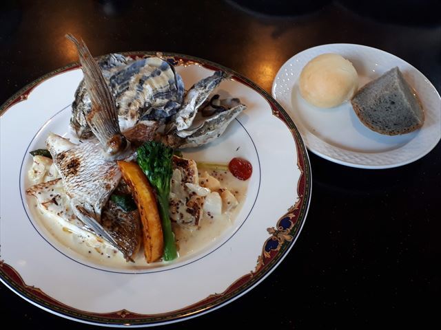 オーダーは、いつものグルメセット(3600円:税込)で主人はジューシー鶏モモ(骨なし)ステーキ、私は鯛と魚介のポワレ(坊勢の牡蛎付+500円)、ミニパスタ(550円)も追加しました。