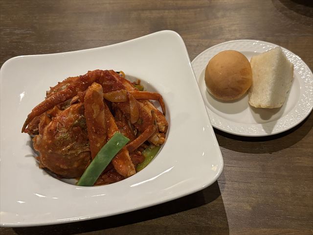 パスタ(渡り蟹のトマトソース)、鯛と魚介のポワレ 2024.12