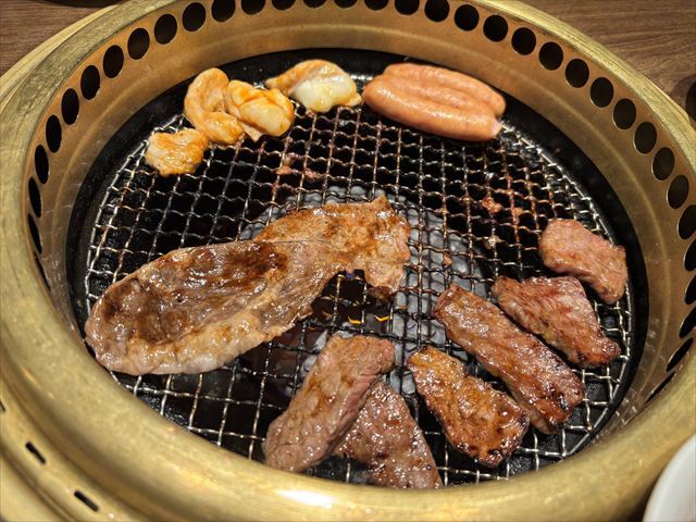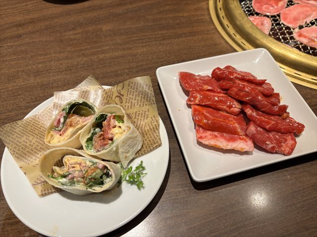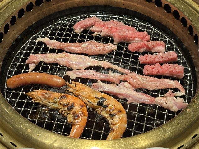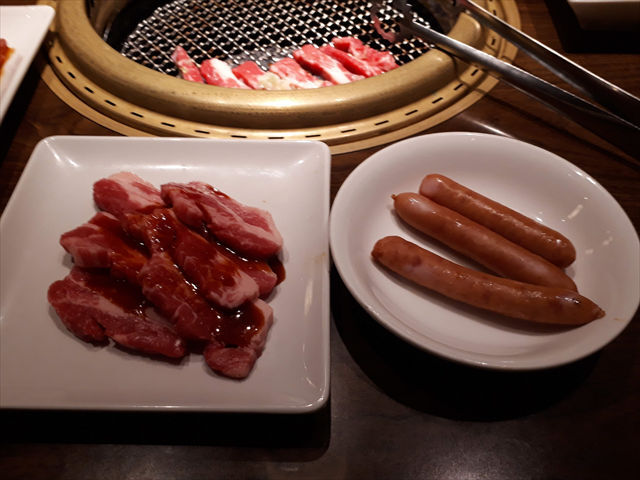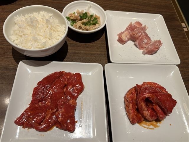 焼肉:塩タン、カルビ、ロース、ハラミ、角切りカルビ、にんにく塩カルビ、鶏もも、和豚もちぶたウインナー、ホルモン、