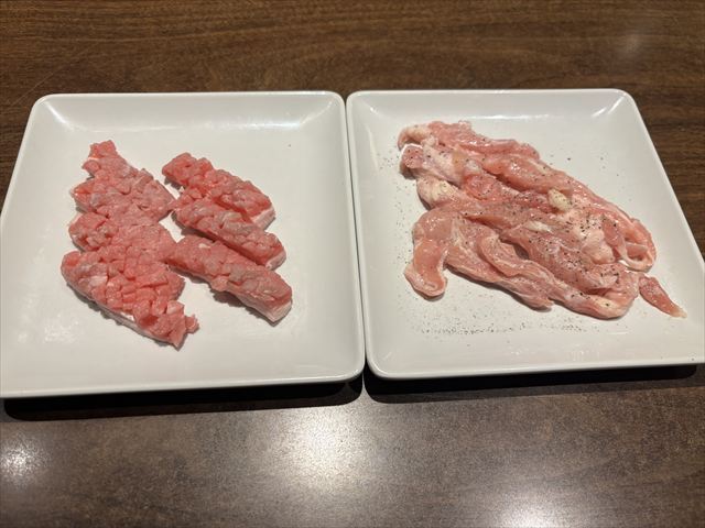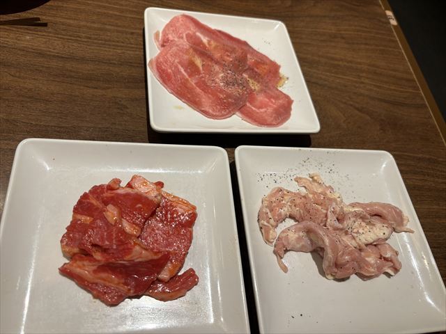 焼肉:塩タン、カルビ、ロース、ハラミ、角切りカルビ、鶏もも、和豚もちぶたウインナー、ホルモン、