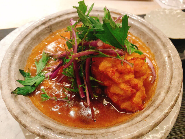 特にトマトと蟹のあんかけに揚げフカヒレと野菜を乗せた一品は絶品でした…トマトの酸味、蟹の甘味、旨味、辣油で辛さを出して味を締めて、フカヒレの唐揚げでかりっと心地よい食感まで…まさに五感を満足させる逸品。これは1番好きなフカヒレ料理かも…と思ってしまいました。廣澤さんの天才的センスに脱帽。