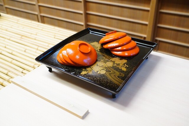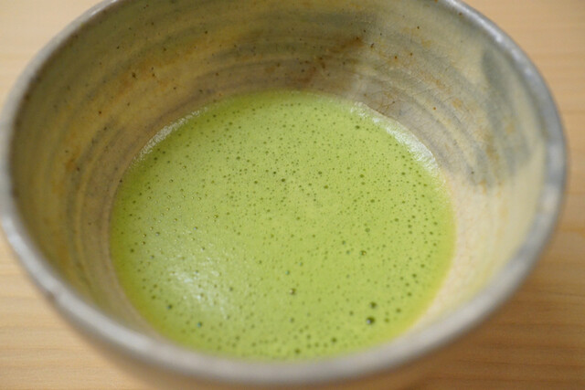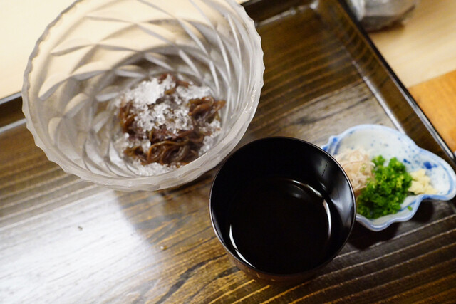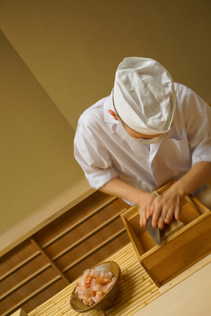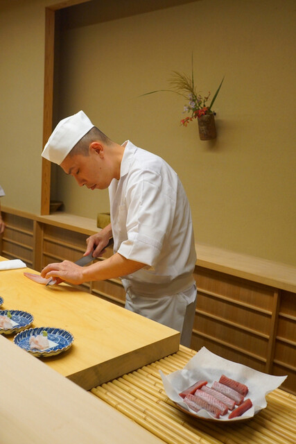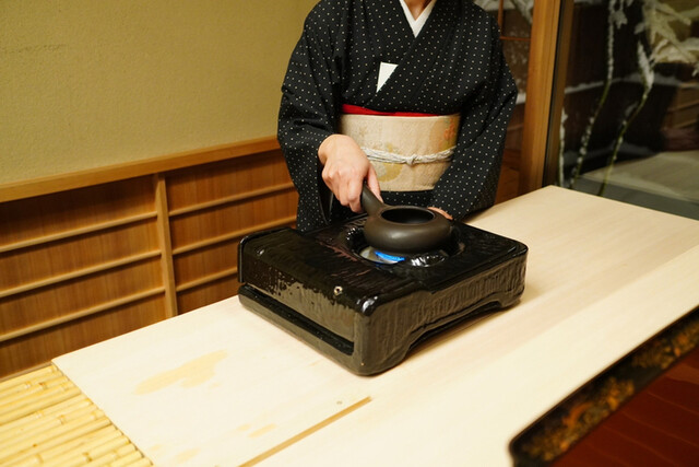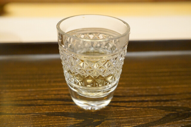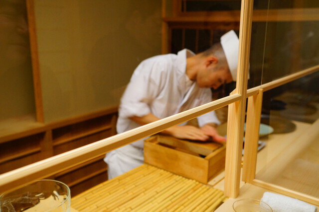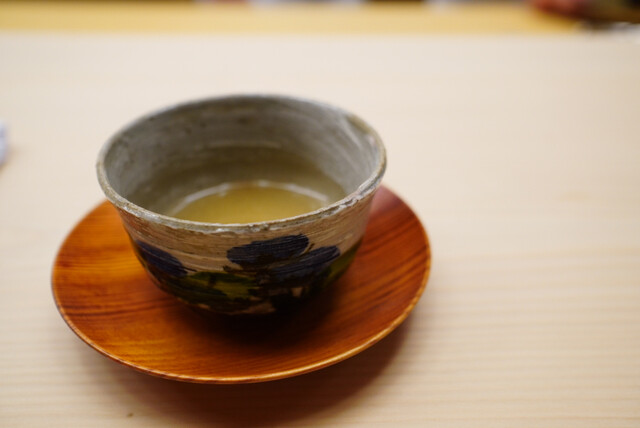 貸切で6席。まずは綺麗な中庭がみえる落ち着く空気感の待合室に案内され、熱々のおしぼりとお茶で癒される。一息付いてからカウンターに移動。