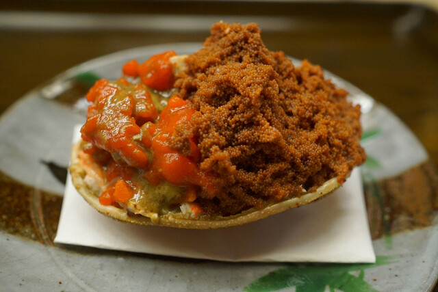 特筆すべきはやはりせこ蟹。ズワイガニの雌は香箱蟹やせこ蟹もしくはコッペ蟹と呼ばれ、普通はあらかじめ前日とかに身を解して甲羅に詰め、冷蔵庫に保管してから出すのが一般的。それでも十分美味しいが、そんなことはどこの料理屋でもやってること。片折ではその日取れた新鮮なせこ蟹を直前に剥いて、低温でじっくり火入れして半生で仕上げる苦労も厭わない。これがまた別次元の美味しさを生み出す。まさに唯一無二、究極の、日本一のせこ蟹だ。カニの有名な店はかなり食べ歩いてきたがここのせこ蟹を食べずしてせこ蟹を語るべきではない。