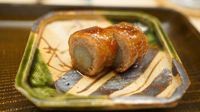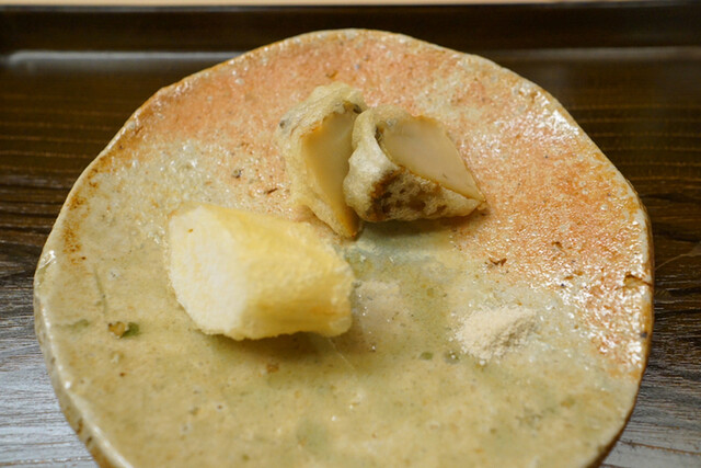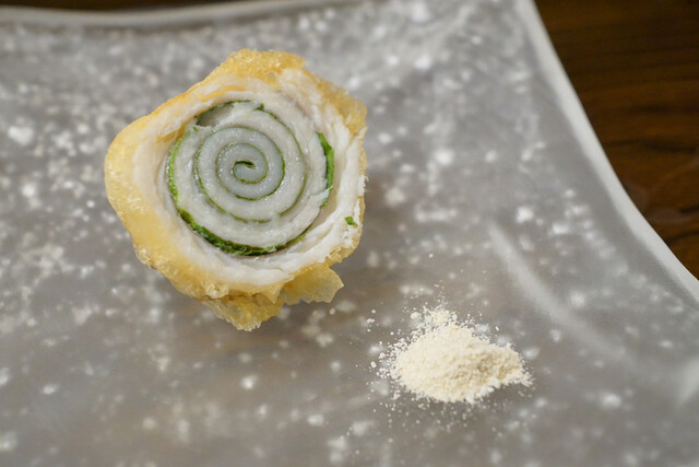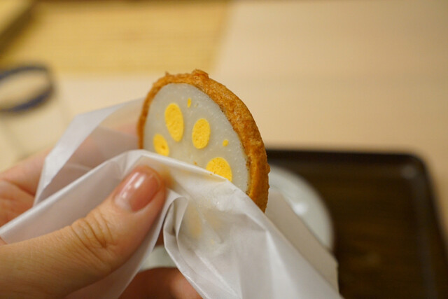 辛子蓮根は外側を揚げていて良い食感と香ばしさが…食材自体の良さを活かせつつそれに頼らずちゃんと手の込んだ料理にしているところが片折さんの素晴らしいところ。