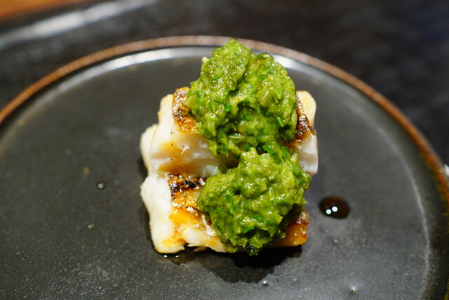 ③鰆(三重県産、4kg)のたたき、九条ネギ&春菊ソース掛け