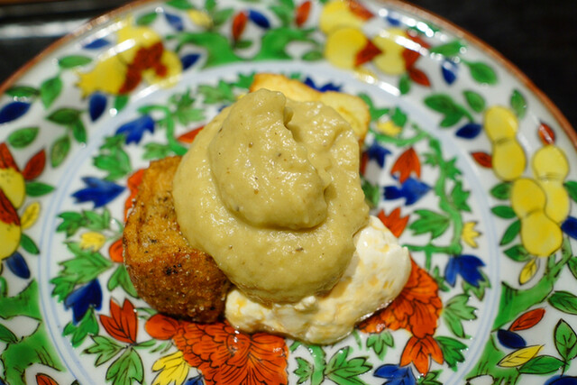 黒胡椒が入った大家の老舗の生麩の素揚げ 鴨茄子のソースとモッチャレーラとトマト 辛子酢味噌が良いアクセント