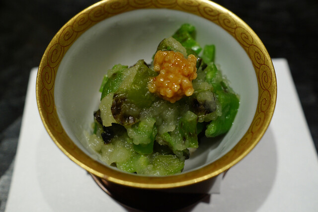 ②こっぺ蟹(兵庫県津居山産)、蝦夷馬糞雲丹、菊花、ホワイトバルサミコ酢と土佐酢のジュレ掛け