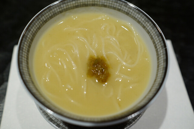 ⑰極細麺、白味噌&グリーンカレーのペーストのつゆ、焼魚栗と黒一味掛け