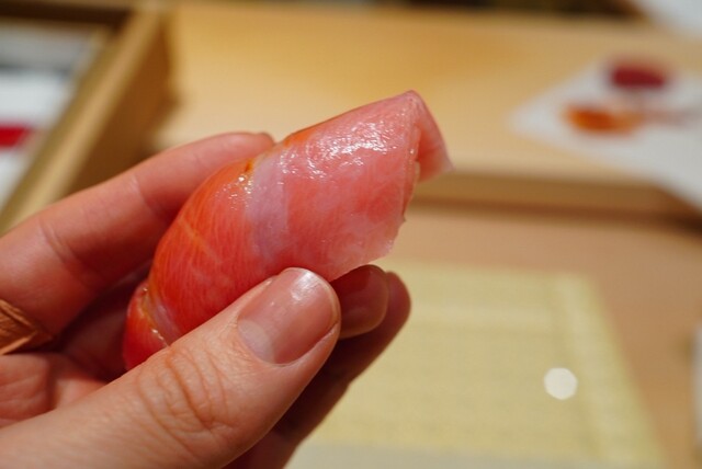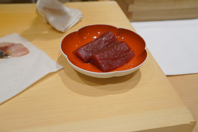 まぐろは大トロから始まり中トロ、赤身の順番。ふつうの順番と逆ですが、これが89のボルドメルローにはベストマッチとのことで。最後の漬けとの組み合わせは確かにこの順番で正解と感じさせてくれました。