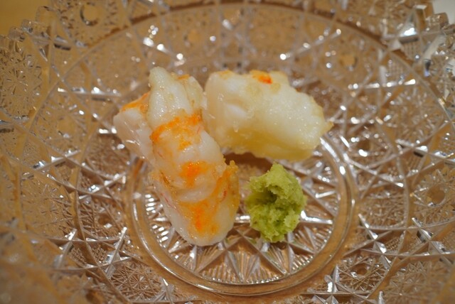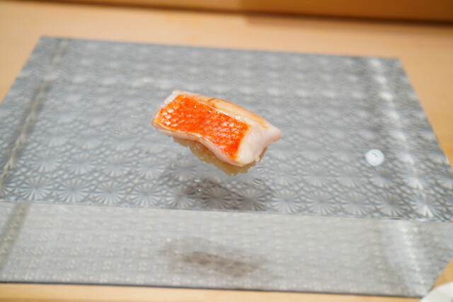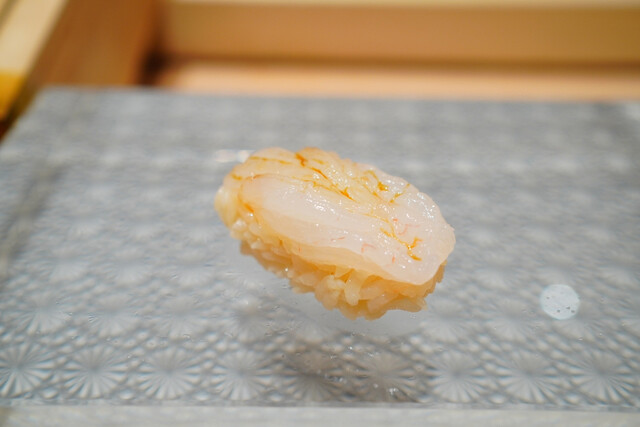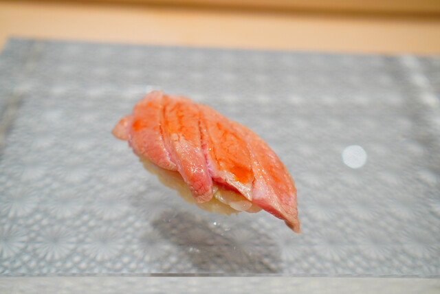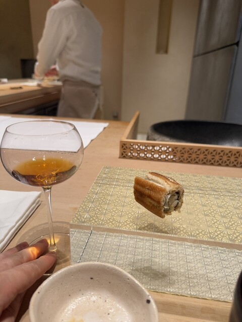 一年ぶりに伺いましたが、大将は相変わらず優しく迎えてくださいました。カウンターの上には江戸切子の特注品、7センチ、6キロのガラス製の台の存在感がすごい… 不可能と言われたものを無理言って作ってもらったらしく、素晴らしい台座でした。これは芸術の域ですね。三谷さんの寿司とペアリングにぴったりです。他のお客さんもワイン好きな方が集まっていたからか大将もいつも以上にペアリングに気合いが入っている様子で、ドンペリ76とかコントラフォン、ルーミエなど素晴らしいラインナップが続き、〆はジャックセロスのVO。