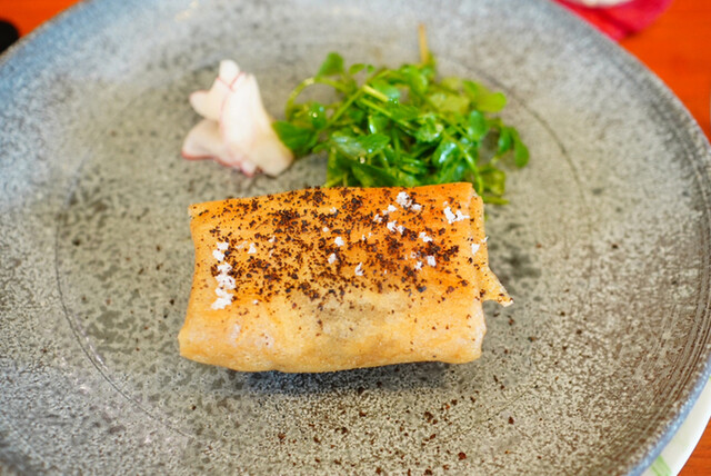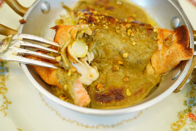○ネマガリタケの新芽、白馬の鱒と藁で燻したチーズのクレープ包。ピスタチオのクリームをのせて、アスパラとグラタン風に仕上げ。