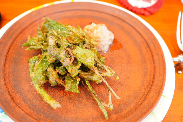 ○コシアブラ、山葡萄の実と新芽、アザミの新芽、タラの芽の揚げ物 発酵蕎麦粉