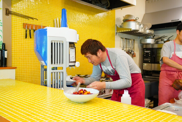 ○木苺(4種類)とスミレのシロップをかけた浅間山の天然氷のかき氷。中にはチョコチップジェラート。こちらはブラウンスイス牛の牛乳を絞って作ったジェラートにアマゾンカカオのチップを混ぜ込んでいる。