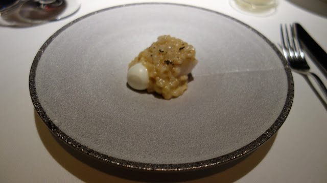メヌケのグリル、ウズラの卵、銀杏に玄米のリゾットがかけられています。