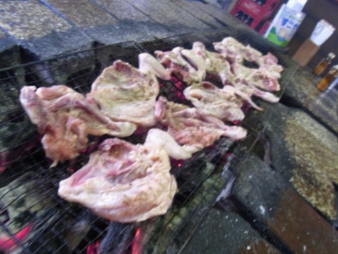 なかに入ると炭火の焼き場が一列に並んでいます。そしてその両側に陣取ると自動的に鶏を半身に