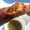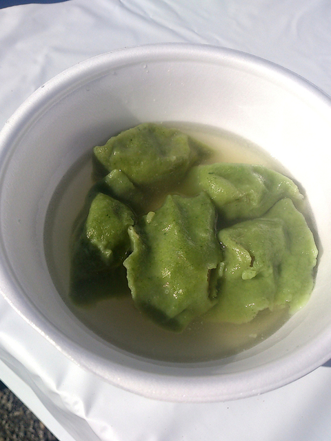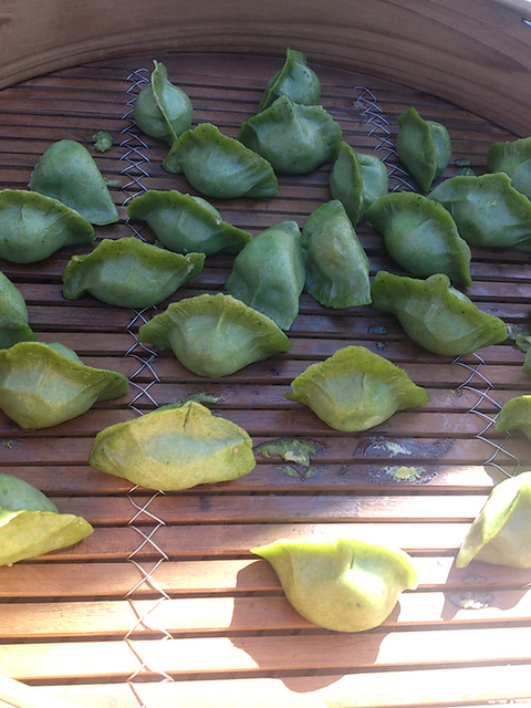 今回は、よもぎ色した餃子と黒糖のドーナツ、肉じゃがなどを頂きました。