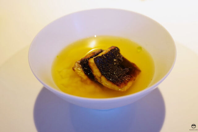 キジハタ、味噌マリネ、レモングラス、レモン味噌の泡、醤油ジュレ、ボラ節。キジハタは皮目のみ軽く炙っている。ボラ節の香りがスモーキーで食欲をそそり、キジハタの旨味と脂がどんどん広がり、レモングラスの爽やかな香りや少量のみじん切り生姜の香りと食感が爽やかにまとめていく。全体的に香りが非常に魅力的だ。