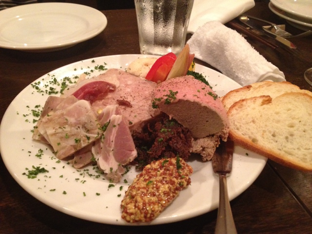最初の豚のパテからいろんなお肉の盛り合わせが、まず最高です。美味しいにバケットやワインが進みます。