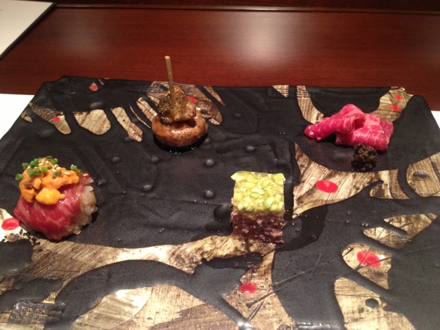 まずは4種類の前菜から、和食器の器に刺身でいただける牛肉やうにと合わせたもの、ミノとシイタケ、タンと豆を使った凝ったお料理など最初からここは美味しいぞという期待も持たせるのに十分な前菜。