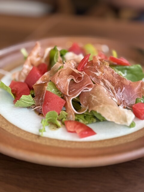 それ以外に、生ハムとルッコラ野菜のサラダ、ホタテの薪火焼き、鶏肉の薪火焼きも注文
