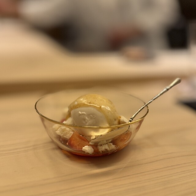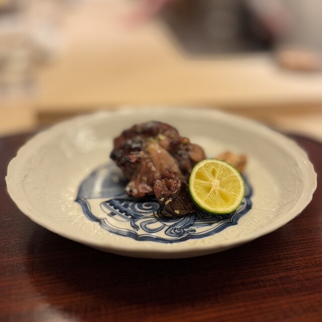カラスミの余韻が残る中、白子の登場。白味噌に入った白子は炭火焼されており、絶妙の食感。カリッとした食感の後に一気に白子のクリーミーで風味のある味わいが口の中を支配。白味噌はかなりまったりさせており白子の風味をアシスト。そして、ハチミツのように芳醇でセクシーなDomaine Roulot Meursault Tessons Clos de Monplaisir 2006と合わせる。最高です。