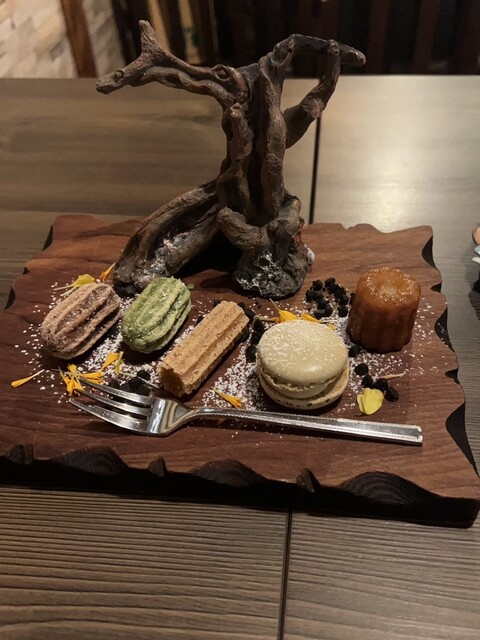 コースの締めくくりは遊び心たっぷりのデザート。「テラリウム(箱庭)」を模したガラス容器の中に、小さなスイーツやフルーツ、クランブル(土に見立てたクッキー)などが美しく盛り付けられ、まるで食べられるミニチュアガーデンのよう! 味だけでなく見た目でも物語の世界観を表現した逸品でした。