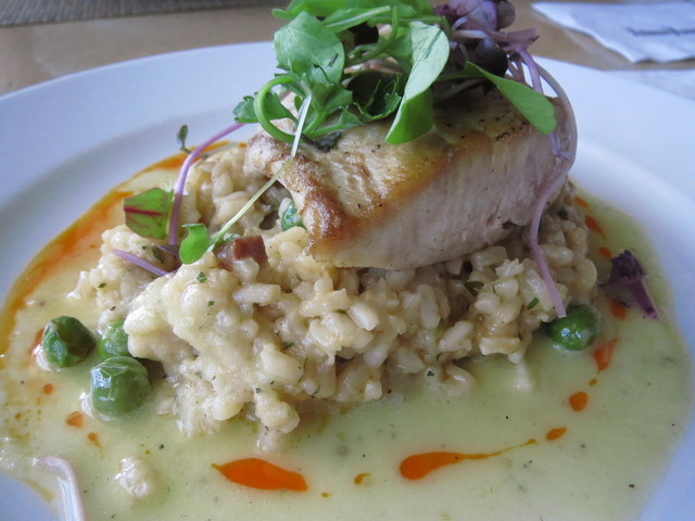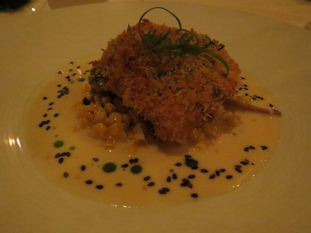 浜鯛のパン粉焼き、味噌と胡麻、生姜のクリームスープ