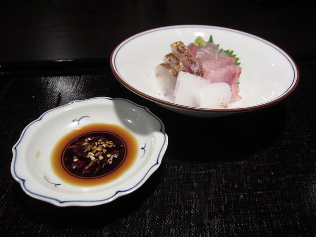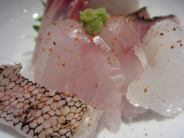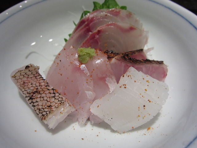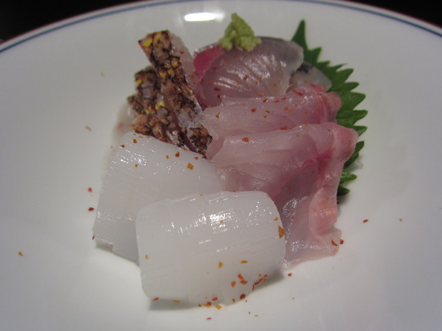 お造り1 -カンパチ、コショウダイ、石垣鯛の炙り、真鯛、アオリイカ-