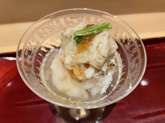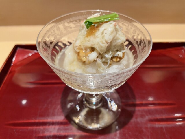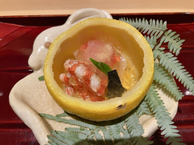 先付:柚子釜 松葉蟹と勢子蟹、雲丹、牡丹海老、子持ち昆布、蝦夷鮑、蕪、土佐酢1